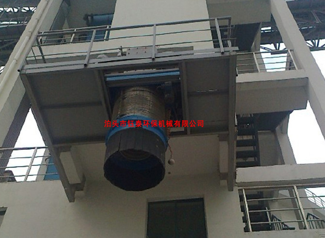 伸縮溜管采用雙層套管結構,由溜筒和防塵罩構成。溜筒內通過物料,防塵罩外套在溜筒上,期間行程吸塵腔。無塵伸縮溜管底部將設料位傳感器和防塵群罩。料位傳感器將設在外側或內側,防塵群罩將采用分塊重疊式。在裝車過程中料位傳感器接觸物料后,無塵伸縮溜管將及時提升使料頂與堆積的物料始終保持一定距離。防塵罩能罩在料堆上,以保證吸塵效果,防止粉塵外溢。溜筒將采用附有聚氨酯耐磨襯板的鋼板制成,防塵罩采用防靜電柔軟強度大的化纖材料制成。防塵罩內將設置支承骨架,既可上下伸縮,又可保證氣流通暢。伸縮溜管升降自如,無阻滯現象;在伸縮溜管底部將至少設3個吊點,以保證升降機構帶動伸縮溜管平穩升降。伸縮溜管外形尺寸圖/外伸縮防塵罩圖片